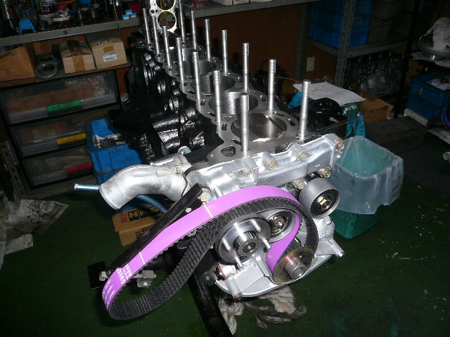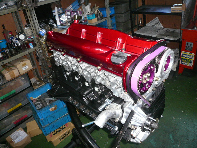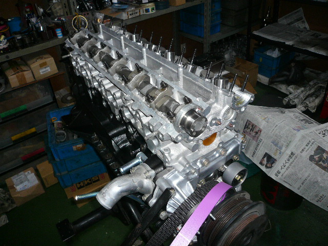 | GT-R RB2.8 エンジン製作中! HKS製品 が組み込まれた腰下に ヘッド加工終えたヘッドにバルブ・スプリング カム等が組まれ徐々にエンジンらしくなってきた。 ここまでできれば誰が見てもエンジンと解りますね! これより先は、スロットル・サージタンク・タコ足・ タービン等が組まれていきます。 シングルタービンになるのか?ツインタービンになるのか? 仕様目的によって様々・どんなエンジンになるんでしょうね? | |