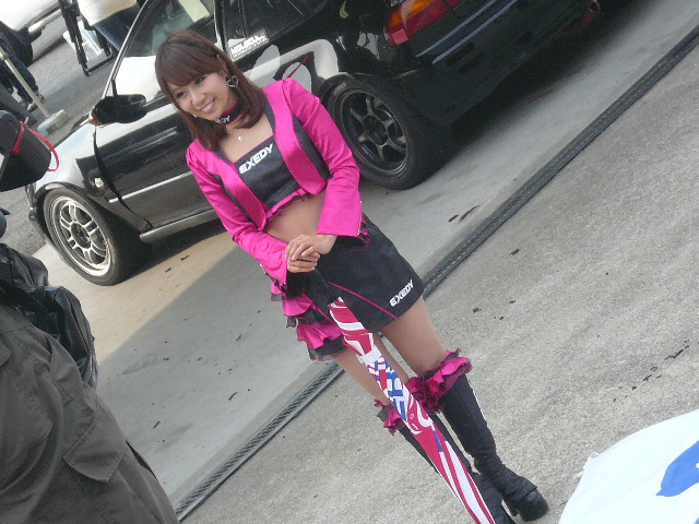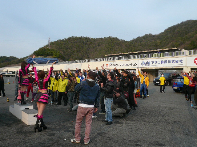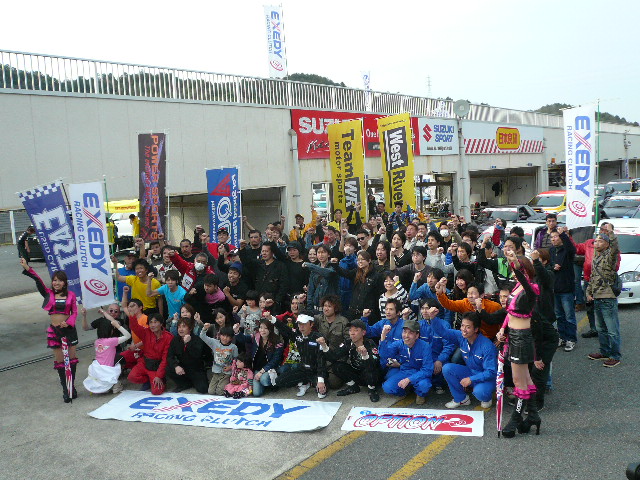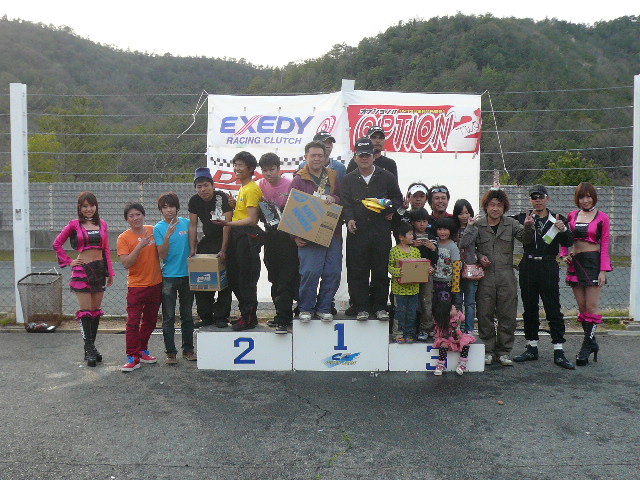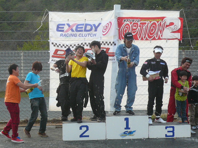 | 「 エクセディカップオプション2 お遊び耐久レース」 喜びの表彰あとは、 お決まりのシャンパンファイト! 次も、お決まり エクセディギャルと、来場者全員でじゃんけん大会! そして、最後に若者にプレゼント! プロドライバー シャーク井入さんと記念撮影! | |