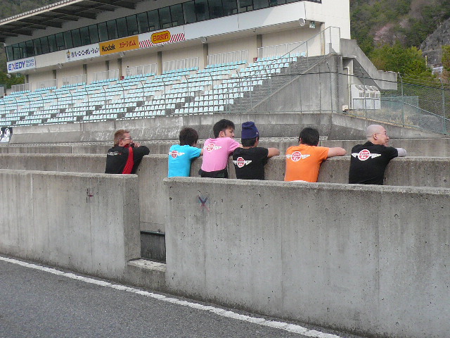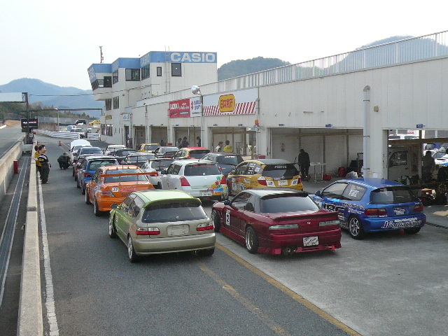 | 「 EXEDY CUP OPTION2 ENJOY ENDURANCE RACE」 九州料理「寅吉」とその仲間たち、間もなくゴール! 完走、ゴールをめざし走り続ける耐久マシンの帰りを 横一列になり待つメンバーたち! 無事完走! 初参戦し、耐久レース完走は立派です! ほぼ、自分たちで仕上げた車両で、しかもサーキット経験もほぼ初心者 立派です! 無事、3時間走り切った車両たち。 | |