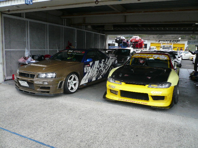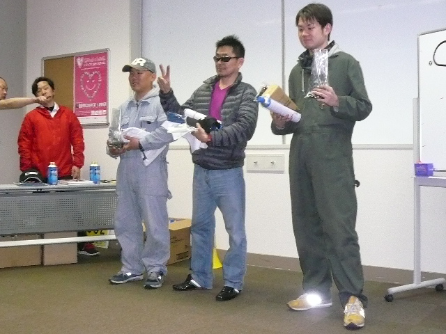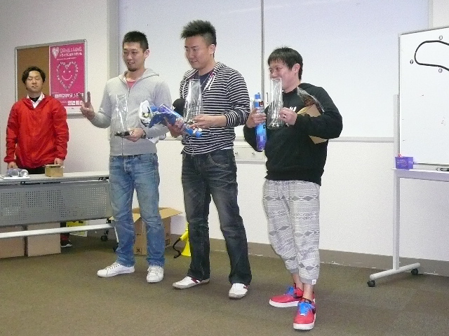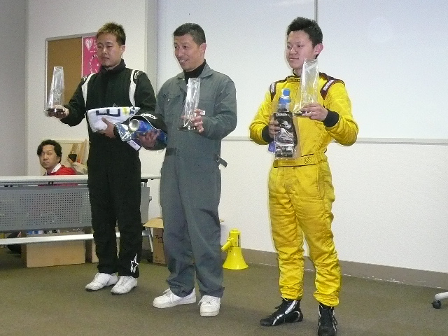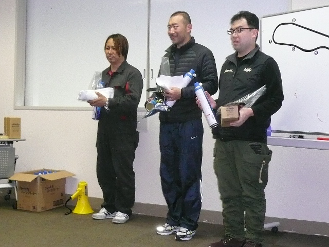 | グリーティングルーム、部屋での表彰式となりました。 表彰台は無しです。(画像の中央が優勝、左が2位、右が3位) Aクラス 優勝:R35 GTR 安藤選手 2位:80スープラ 石選手 3位:RX7 勝木選手 Bクラス 優勝:R34スカイライン 加藤選手 2位:S15シルビア 谷本選手 3位:34GTR 野岸選手 CTクラス 優勝:GC8インプレッサ 熊田選手 2位:GRBインプレッサ 坂本選手 3位:S14シルビア 三木選手 | |