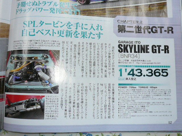 | HKS プレミアムデイ FUJIスーパーラップにて 好タイムを記録したHKSテクニカルファクトリーのR35GT-RやトップシークレットR35に、オーテック塚田R32GT-R、オートギャラリー横浜R34GT-Rがついこの間富士にてアタックしたようです。 なんとなんとテクニカルファクトリーさん、1.40.チョイですって! トップシークレットさんとこのR35も 40秒フラットですって! オーテック塚田さんとこは、1.42秒台にタイムダウンみたい? 当社の、34GT-Rまだまだ頑張ります。狙いますよ41秒台! 35GT-Rは、予算が・・・?しばらくブーストアップでがんばりま〜す。 (画像はオプション誌・4月号でして上記内容とは、関係ありません) | |
